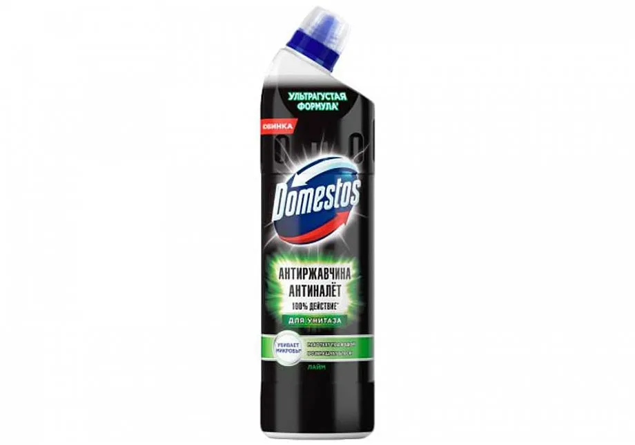- Domestos – эффективное средство для удаления мочевого камня и ржавчины. Активный компонент – гипорохлорит натрия. Состав агрессивен, поэтому нужно строго следовать прилагаемой инструкции по применению. Если жидкость равномерно не распределить по всей поверхности, то могут остаться следы.
