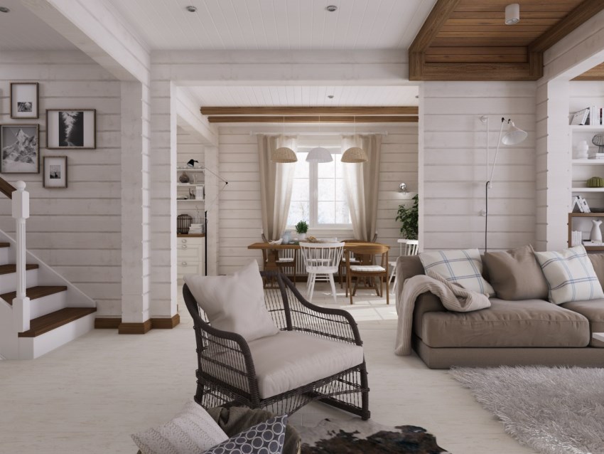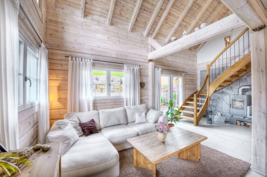 Бревенчатый домик, с интерьером, оформленным в скандинавском стиле, имеет высокие окна с красивыми откосами и широкими подоконниками, а также широкие дверные проемы. Это нужно помнить еще на стадии проектирования дома, чтобы потом не получить дополнительные проблемы. Палитра такого стиля содержит белый, серый и бежевый цвета. В обстановке превалируют лаконизм и практичность, с минимумом декора.