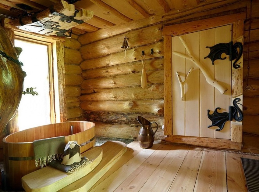 Ванная, оформленная в старых русских традициях