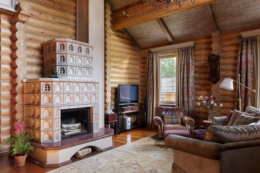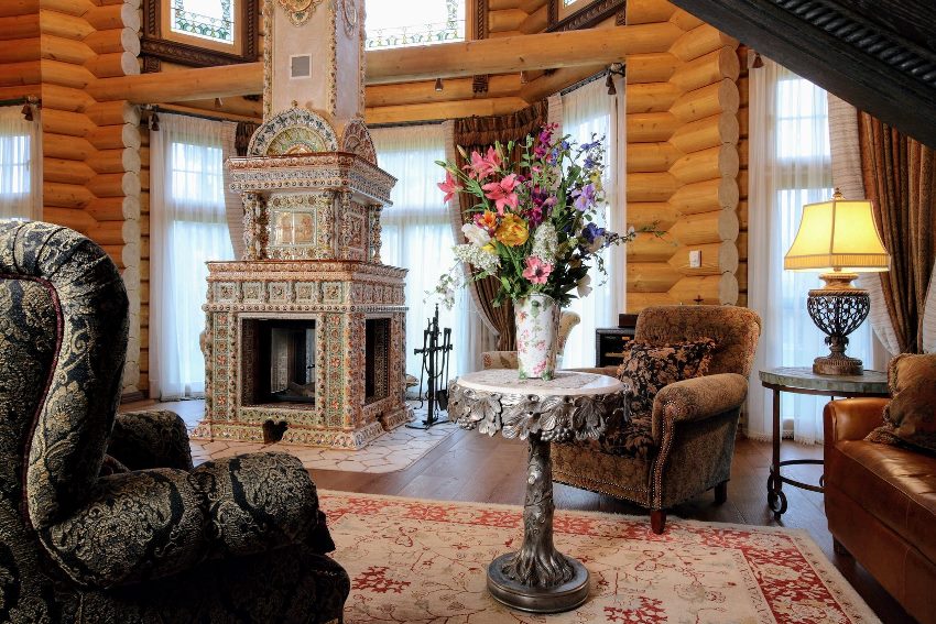Камин с изразцами в середине гостиной дома в русском стиле