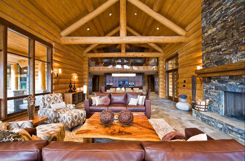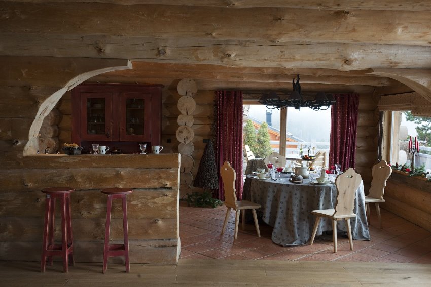 Интерьер альпийского бревенчатого дома содержит больше необработанной древесины, элементов из камня, грубые сорта ткани и кожу. Пространство комнат обставляется простой, габаритной мебелью «под старину», дополняется коврами, шкурами или пледами. Присутствует много камня – в камине, перегородках, дверных проемах.