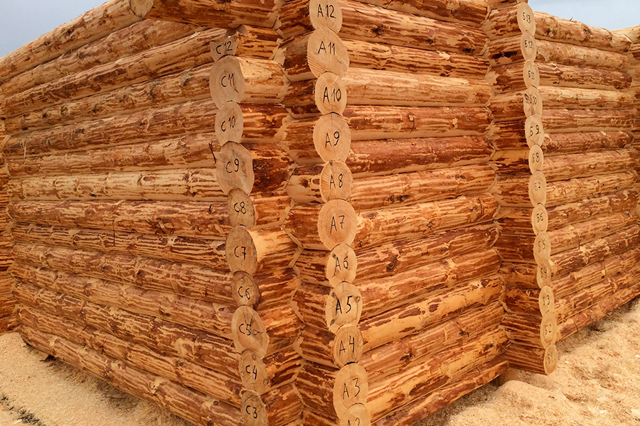 Удаляем все сучки и неровности со ствола, в итоге бревно становится похоже на оцилиндрованное, но сохраняет свою текстуру. Далее изготавливается первый венец — основа будущего сруба. На него приходится наибольшая нагрузка, поэтому бревно должно быть очень прочным и толстым. Далее мастера вручную подбирают остальные бревна. На каждом из них размечают паз и замок, чуть позже их вырубают топором. После укладки все венцы маркируются, чтобы бригада позже собрала их на участке заказчика.