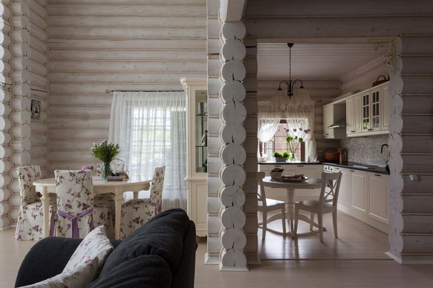Столовая и кухня в доме из неоцилиндрованного бревна