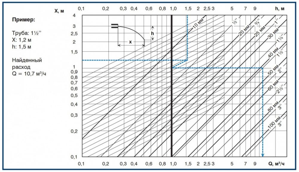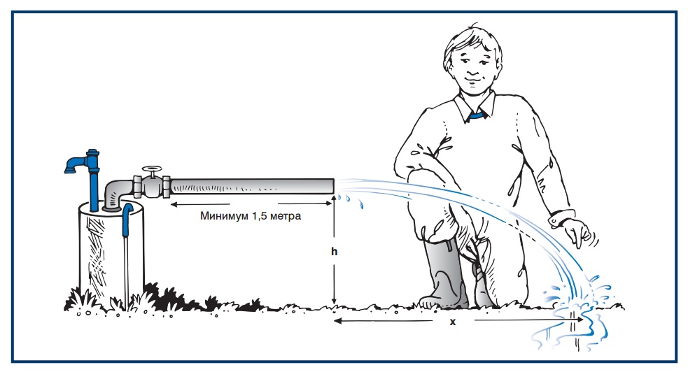 В последнем случае, необходимо на выходе водоподъемной трубы закрепить в горизонтальном положении трубу меньшего диаметра. И произвести следующие замеры: