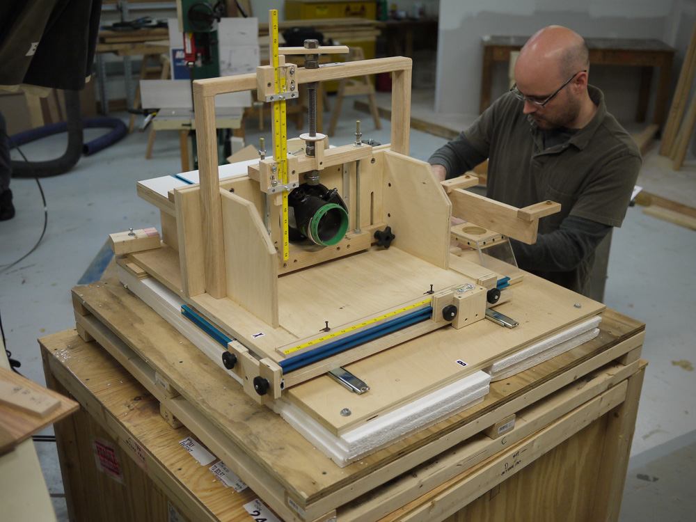 На подвижную каретку, способную двигаться перпендикулярно оси вращения заготовки, устанавливается ручная фрезерная машинка. При этом расстояние до центра заготовки определяется упорно-направляющим роликом, который перемещается по шаблону.