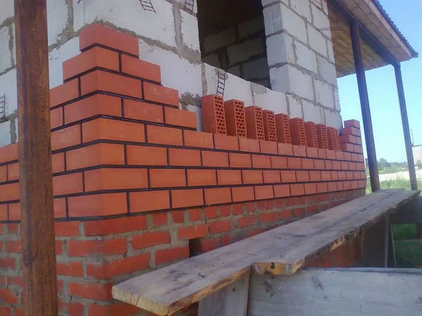 Горизонтальную погрешность выравнивают с применением раствора, кладку осуществляют на клей. Швы должны иметь небольшую толщину – до 1 мм. Смесь готовьте строго по инструкции и наносите сначала на горизонтальную, а потом на вертикальную сторону блока. Готовый ряд кладки тщательно выравнивают в горизонтальном направлении шлифовальной теркой, пыль сметают.
