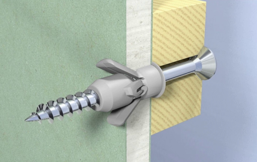Перед тем как установить дюбель-бабочку для гипсокартона, в поверхности выполняется сквозное отверстие. В него вставляется крепежное изделие, которое с обратной стороны в свободном пространстве раскрывается и упирается в основание при вкручивании в него самореза.