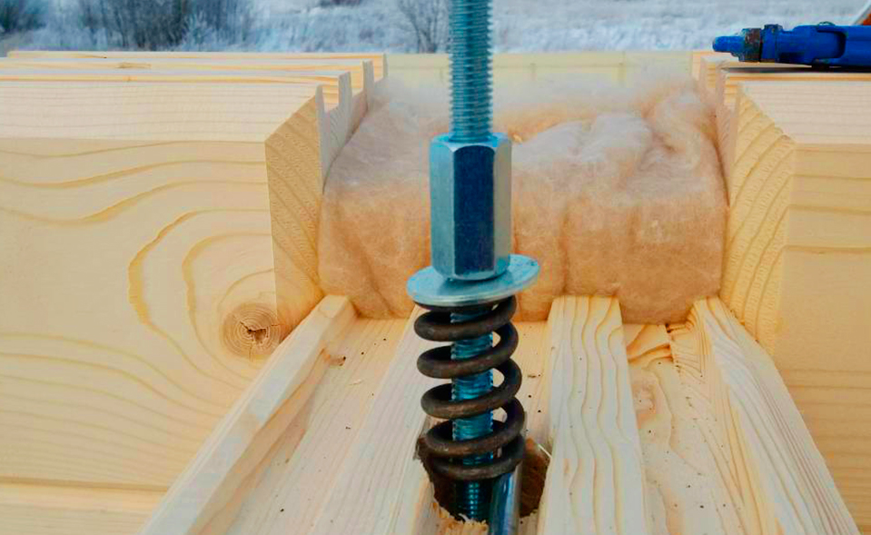 В комплектацию входят исключительно профессиональные детали крепежа, в том числе усиленные оцинкованные шпильки сквозного типа, пружина серии SILA, специальный усадочный крепеж. Благодаря этому факту, мы гарантируем высокие эксплуатационные характеристики дома из бруса. Поэтому наши дома не зависят от негативных эффектов применения классических крепежных элементов, как это было бывает с применением деревянных нагелей. Шпильки — единственный крепеж, который позволяет регулировать стеновой комплект по усадке.