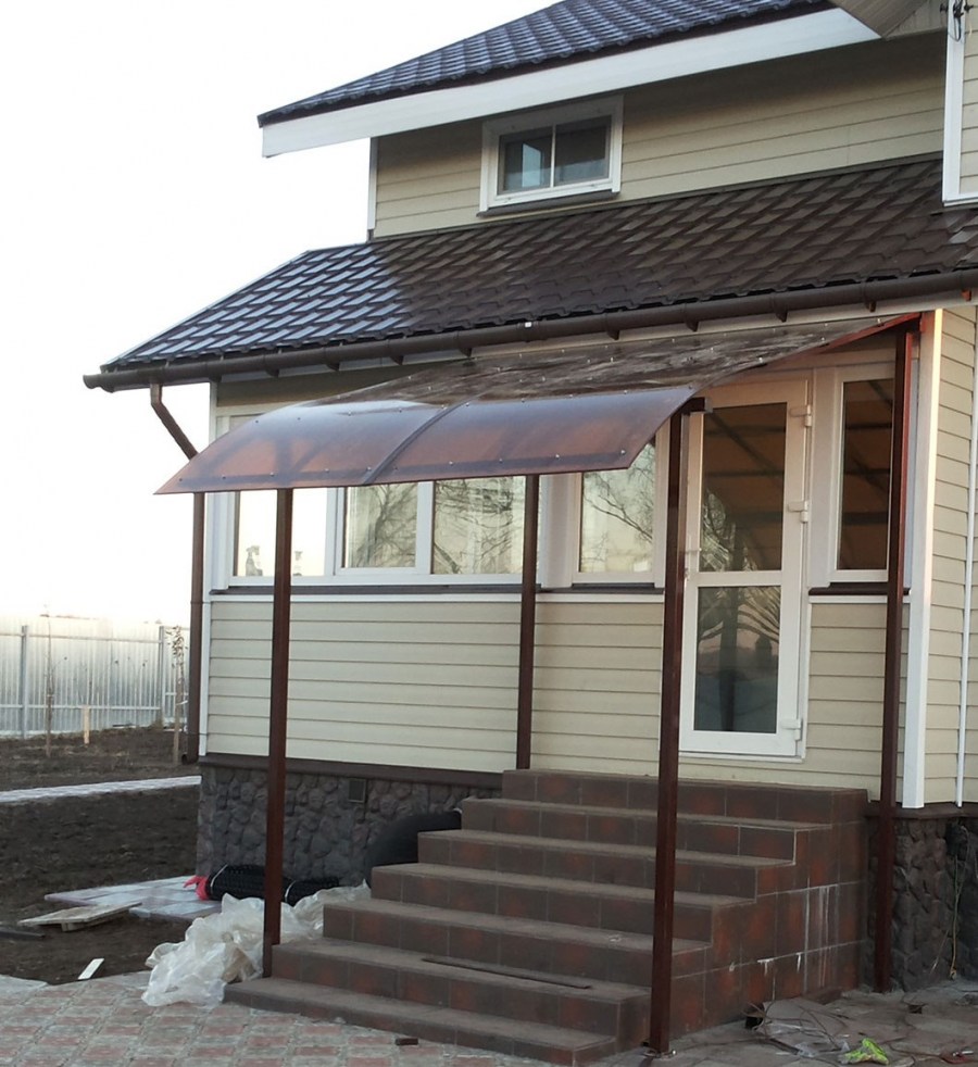 Под козырьком над крыльцом укрывают не только дверь, но и ближайшее окно, лестницу или уличный фонарь.