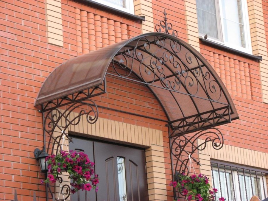 В России чаще всего делают козырек из дерева, нередко украшая его резьбой в национальных традициях. Хотя в последнее время довольно часто стали встречаться конструкции с кованой основой.