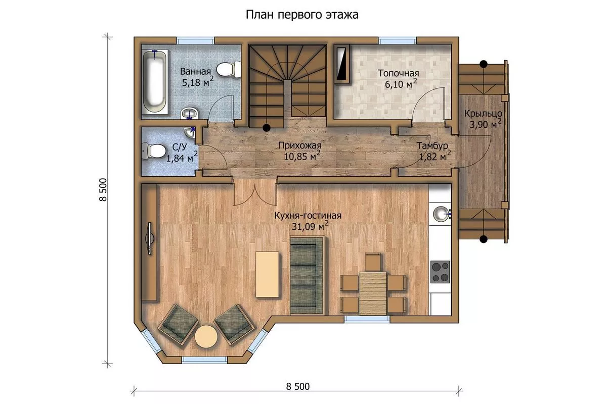 - небольшой дом до 100 м² для семьи без детей (планировка предполагает расположение спальни на первом этаже, а на втором этаже — наличие гостевых комнат).