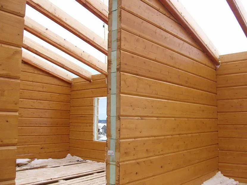 Потолок состоит из нескольких потолочных лагов, которые крепятся методом «шип в паз» к верхнему ряду бруса. Остальные манипуляции идентично полу. Между чистовым и черновым потолком можно дополнительно проложить утеплитель, изоляцию. В дальнейшем это может сократить теплопотери до 30%.