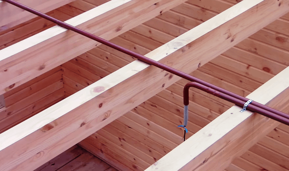 Для внедрения изолирующих труб в стены потребуется сверление, как в горизонтальном, так и в вертикальном направлениях. Вертикальные отверстия сверлятся в процессе укладки сруба, горизонтальные тогда, когда стены уже возведены. После того, как трубы будут закреплены в теле деревянных стен, в них заводится провод, который послужит проводником для протяжки провода. Посадочные места аккуратно вырубаются под габариты элементов разводки, в них крепятся изолирующие металлические короба.