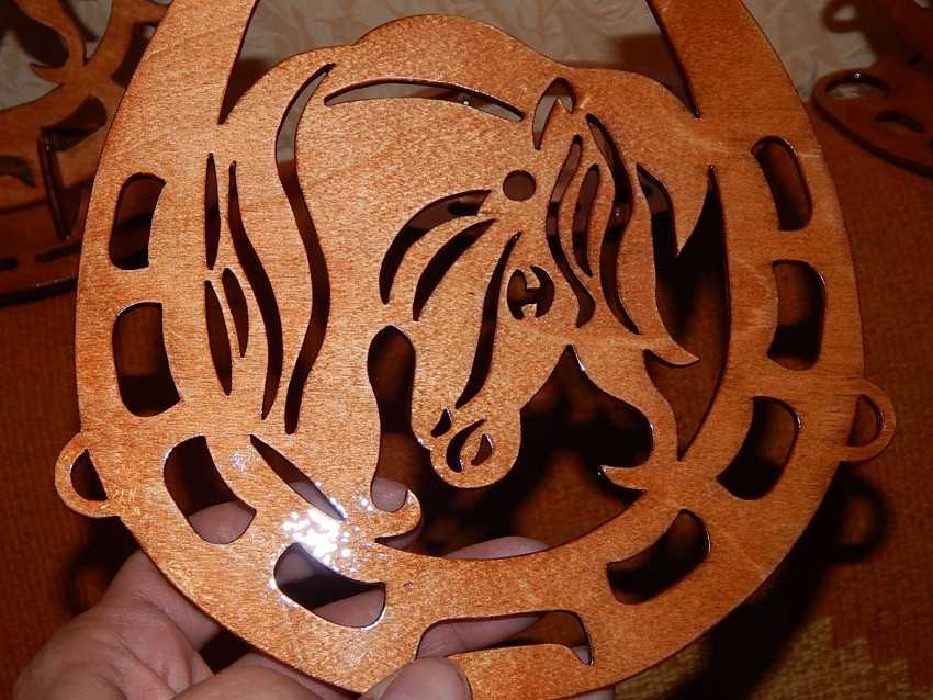 - Края вырезанной детали тщательно затирают и шлифуют при помощи мелкодисперсной наждачной бумаги, чтобы изделие получилось гладким, не имело заусениц и сучков. Далее на него можно нанести детальный рисунок, если это предусмотрено эскизом. Посмотрите на следующее фото, где изображена подобная поделка;