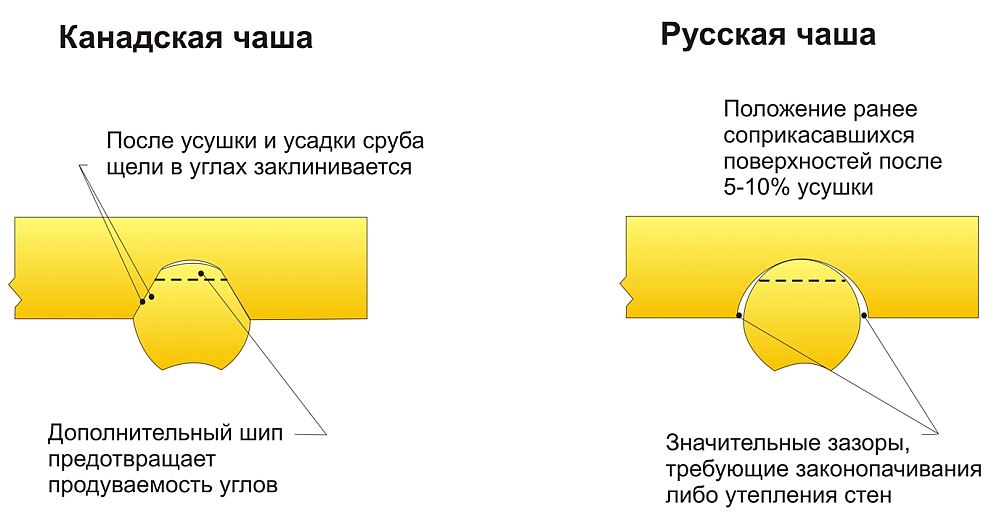 профиль. Выделяют два вида профиля – лунный и финский. Первый – более традиционный, позволяет сделать быстрый монтаж. Второй – имеет проплечины (заплечины) – выступы на гребне, которые защищают место соединения бревен от появления щелей в процессе усадки. Кроме того, тепловой паз при таком профиле больше, что приводит к увеличению числа венцов при постройке стены, но делает ее более теплой, т.к. ширина стены в месте соединения становится больше. К примеру, бревно диаметром 220 мм. с лунным профилем, имеет тепловой паз толщиной 110 мм, а с финским – 140 мм;