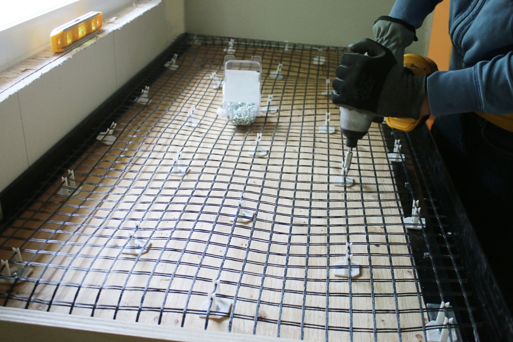 После того как мы ее раскатали и разрезали ножницами для работ по металлу, мы прикрепили так называемые Z-образные зажимы. Они ввинчиваются в фанеру и удерживают сетку на месте. Если бы мы решили обойтись без этих зажимов, во время распределения бетонной смеси по поверхности она могла бы сдвинуть сетку.