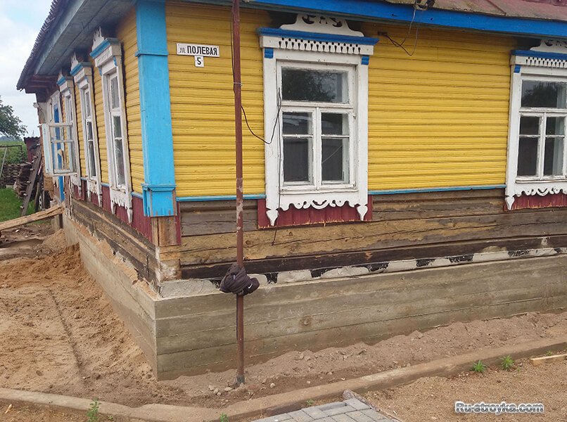 Реставрацию старого деревянного дома своими руками осуществлять значительно сложнее, если разрушение ленточного фундамента происходит неравномерно и дом оседает на одну сторону. В этом случае для того, чтобы произвести реконструкцию фундамента, придется поднимать сруб. Предварительно жилой дом следует освободить от мебели, демонтировать в нем полы, окна и двери. Когда все необходимые процедуры будут выполнены, следует очень аккуратно специальными домкратами приподнять сруб на необходимую высоту и поставить на временные подпорки. Пострадавшую часть следует полностью удалить, поставить новую опалубку и залить новый бетонный цоколь. Чтобы обеспечить единство конструкции, его необходимо соединить со старым фундаментом.
