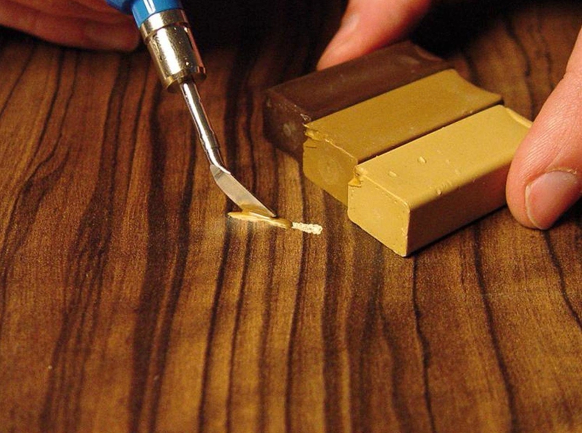 Если на поверхности находятся видимые повреждения, их следует заделать при помощи специальной шпаклевки по дереву соответствующего оттенка или горячего мебельного воска. Мелкие царапины маскируются восковым карандашом.