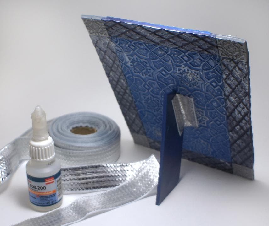 Ждем, пока остынет задняя стенка рамы и кладем ее рисунком вниз. В центральной части размещаем зеркало. Аккуратно смазываем жидкой пластикой рамку.