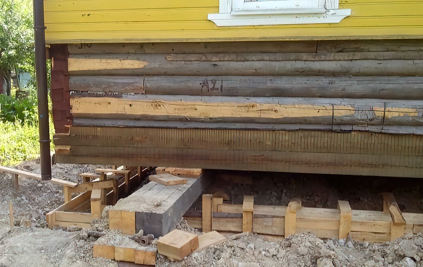 Исключить взаимное смещение бревен деревянного дома можно, зафиксировав их прибитыми к стенам досками. Непосредственный подъем сруба осуществляется несколькими домкратами, которые размещаются в отрытых ямах. Рядом с каждым домкратом устанавливается опора. Чтобы исключить продавливание домкратом дерева, между ним и бревном прокладывается железная пластина, увеличивающая площадь контакта. В месте размещения домкрата древесина должна быть прочной и без заметных следов гнили.