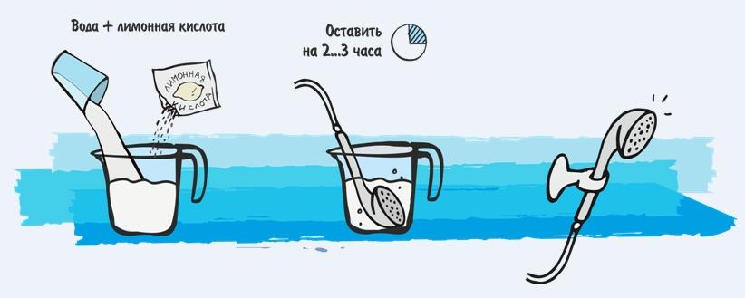 Для очищения лейки душа могут использоваться различные методы, причем допускается пользоваться сразу всеми способами для достижения наилучшего результата. Применяются в этих целях растворы: