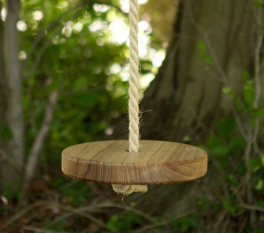Самый простой вариант подвесных садовых качелей – это тарзанка. Канат закрепляют к высокой ветке дерева. Иногда закапывают в землю столб. На верхушке крепят перекладину, к которой привязывают две веревки, чтобы получилась парная тарзанка. Сиденье делают из отрезка тонкого кругляка. По центру сверлят отверстие, пропускают канат, завязывают снизу узел для упора. На тарзанке катаются сидя и стоя.