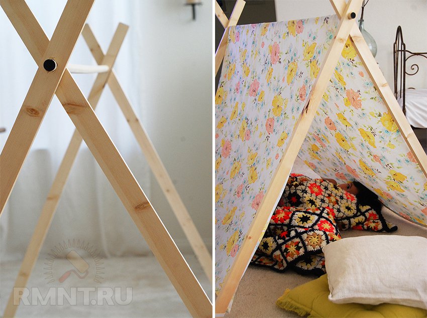 Вигвам, или попросту – шалаш, сшитый из лоскутков ткани треугольной формы, который крепится на основу из деревянных брусков, связанных верёвкой. Несложно догадаться, что строение возводится по принципу старых индейских построек, откуда, собственно, и пришло название.