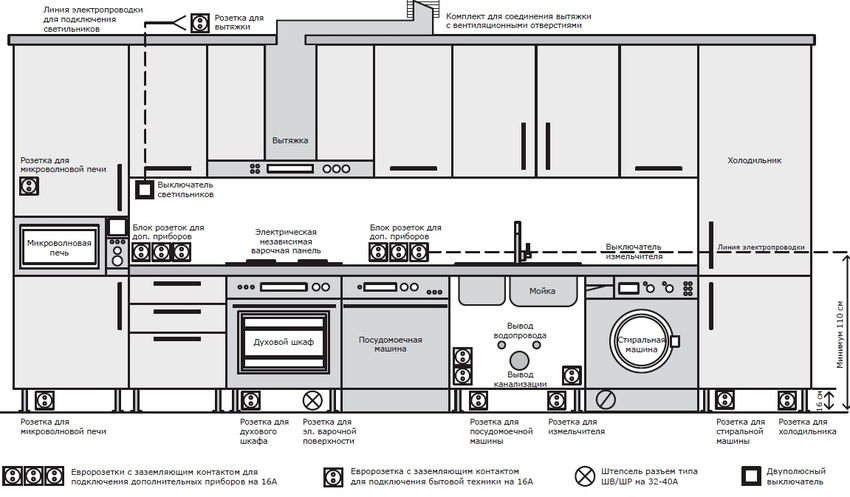 Кроме того планировка кухни под посудомоечную машину должна учитывать наличие электрической розетки с запасом пространства. Учитывая, что мойка потребляет немало электроэнергии, использование удлинителей не только не рекомендуется, но и противопоказано согласно базовым правилам техники безопасности.