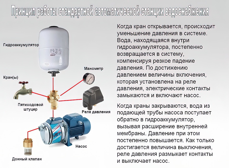Если в доме установлена джакузи, все сложнее. Придется подбирать опытным путем — меняя настройки реле и наблюдая за работой точек водоразбора и бытовой техники. Но при этом рабочее давление не должно быть больше максимально допустимого для другой бытовой техники и сантехнических приборов (указывается в технических характеристиках).