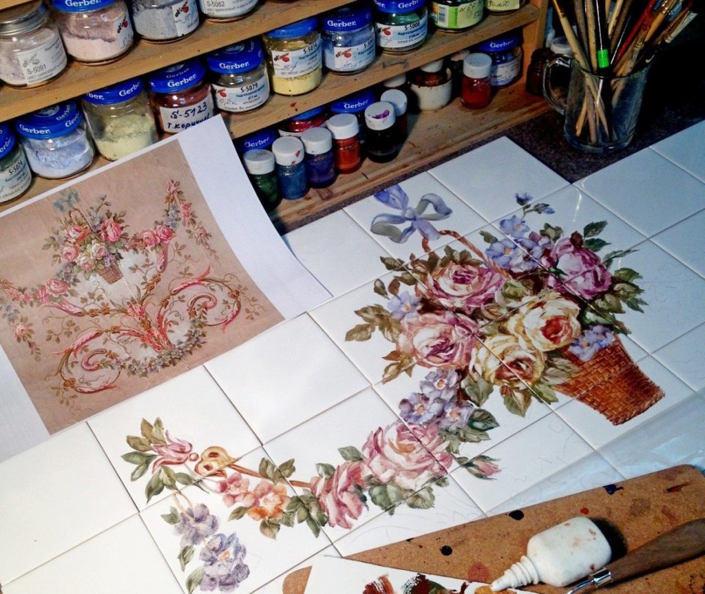 Однотонную керамическую плитку можно также освежить, разрисовав красками. При наличии даже минимальных художественных навыков это сделать несложно.