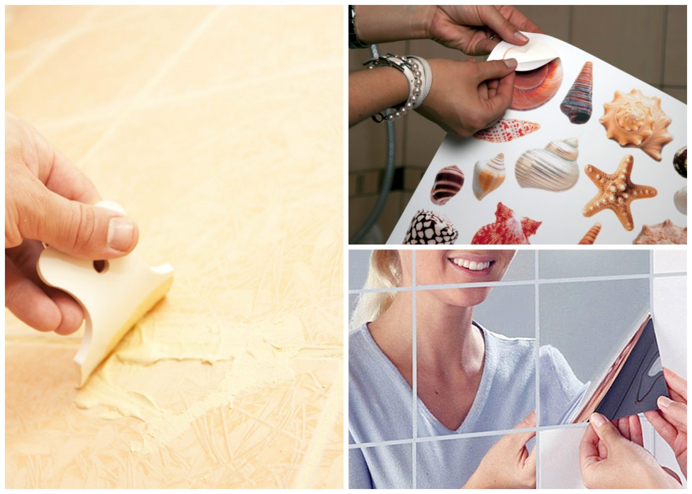 Декорирование кафеля наклейками не требует много времени. Поврежденную плитку перед этим не реконструируют. Виниловые наклейки скроют сколы и трещины.