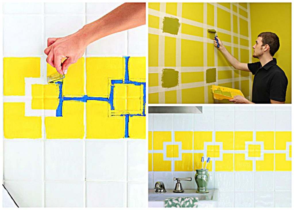 Техника окрашивания плитки с малярным скотчемНо почему обязательно строгая геометрия? Вы можете нарисовать всё, что только захотите. Понадобится лишь воображение, краски и кисть. Техника та же: обезжириваете поверхность и рисуете краской для кафеля или акрилом.