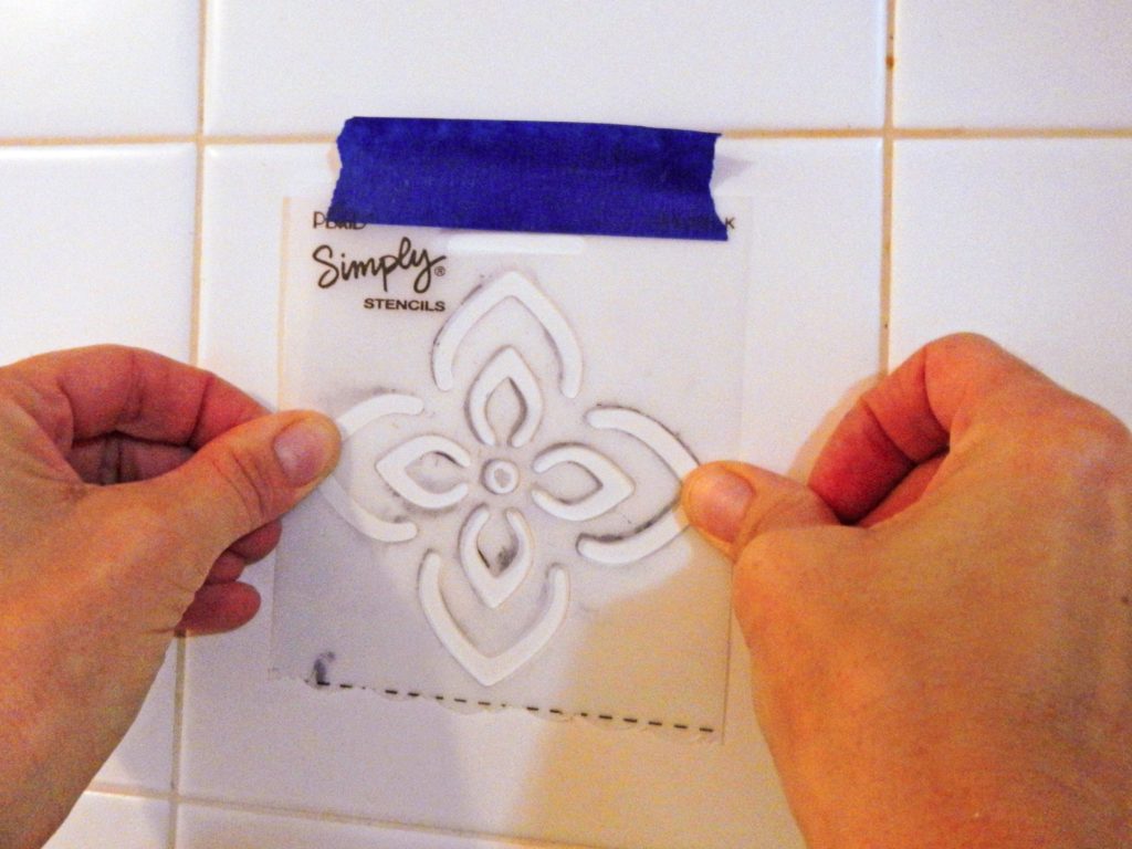 Рисунок на плитку следует выбирать с учетом дизайна помещения. Для ванной в современном стиле подойдут геометрические узоры. Они легко наносятся с помощью трафаретов, которые приклеиваются к плитке. В этом случае стоит воспользоваться аэрозольной краской. Ее удобно распылять на трафарет.