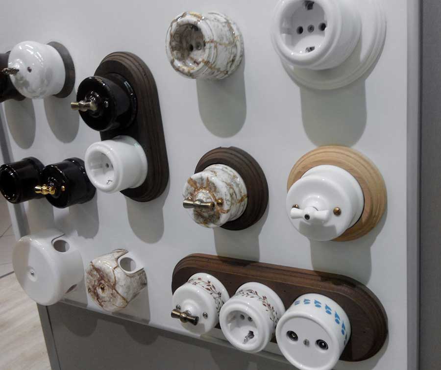 Распеределительные коробки в ретро стиле выполнены из керамики. Они монтируют непосредственно на поверхность стены и не требуют сверления отверстий. Коробки также могут быть разных оттенков – как светлых, так и темных (белый, мраморный, коричневый). Ретро-изоляторы представляют собой втулки из керамики. Такие изоляторы используются для промежуточного крепления провода на стене через определенное расстояние. Керамические ретро-розетки и выключатели также выполнены в аналогичном стиле. На выключателях предусмотрено несколько рабочих положений – поворот осуществляется на 2 или 4 позиции. Для монтажа потребуется минимальный набор инструментов – дрель, нож для зачистки кабеля, отвертки для саморезов, измерительные устройства (нивелир, рулетка), плоскогубцы.