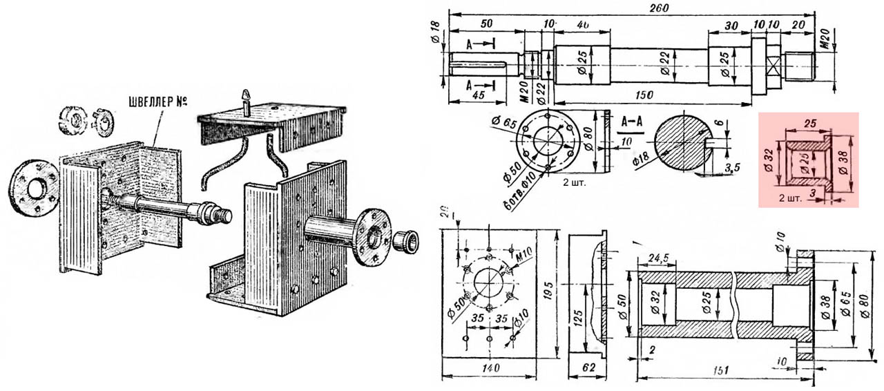 Детали для самого сложного модуля горизонтального фрезера по дереву – шпиндельного узла – сделает любой токарь-умелец аналогично тому же узлу циркулярной пилы; конструктивно они одинаковы (чертежи см. на рис; красным выделены подшипники скольжения).