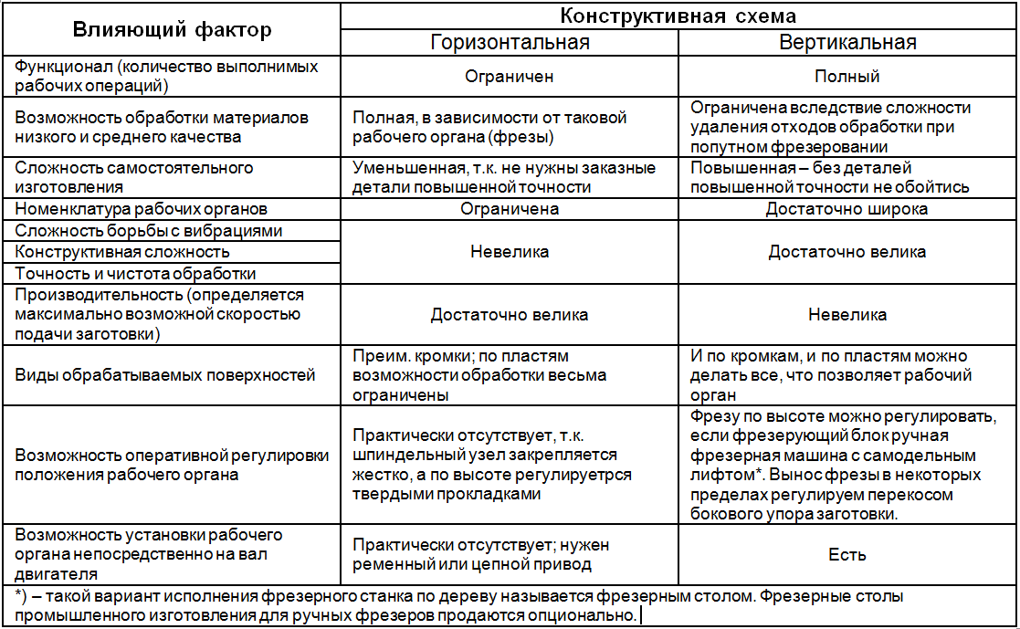 Теперь мы знаем достаточно, чтобы выбрать горизонтальное или вертикальное расположение оси вращения шпинделя станка. Сравнительные эксплуатационные характеристики горизонтального и вертикального фрезерных станков по дереву сведены в табл: