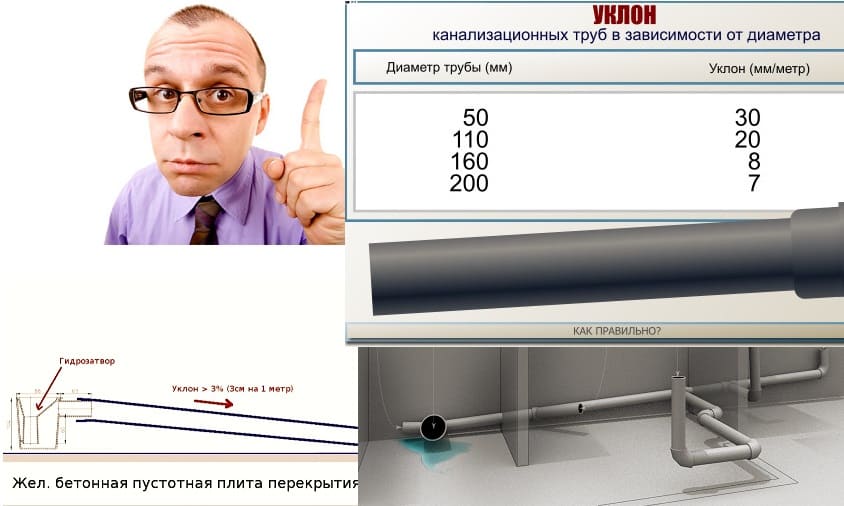 Необходимые уклоны труб (Пример — 1:30. Где 1 погонный метр на 30мм уклона)