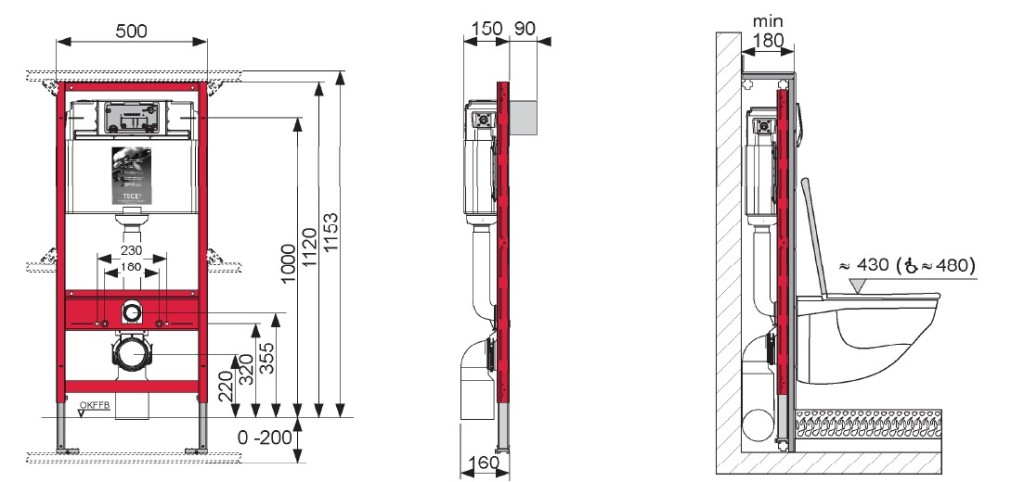 В основе всей конструкции находится жесткая стальная рама, снабженная изготовителем специальным устройством для регулировки высоты. Данная рама надежно крепится к полу и к стене, построенной из бетона или полнотелого кирпича. К гипсокартонным фальшстенам такое оборудование нельзя крепить. Чаша унитаза подвешивается к стальной раме на специальные штыри. Чаша унитаза – после окончания монтажа видимая часть всей конструкции.
