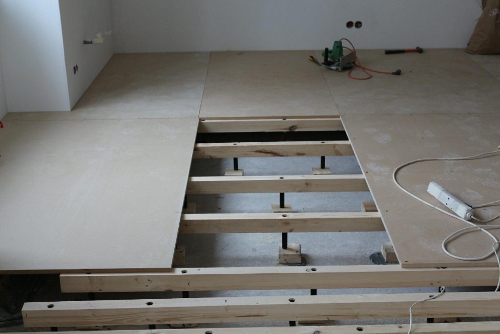 Если полы на бетонном основании (деревянные) было решено монтировать с использованием данного способа, порядок работ таков. Сначала стандартные листы фанеры кроят квадратами со сторонами 40/80 сантиметров, тщательно их шлифуют, кладут в направлении будущего покрытия, оставляя промежуток между ними в 4 миллиметра.