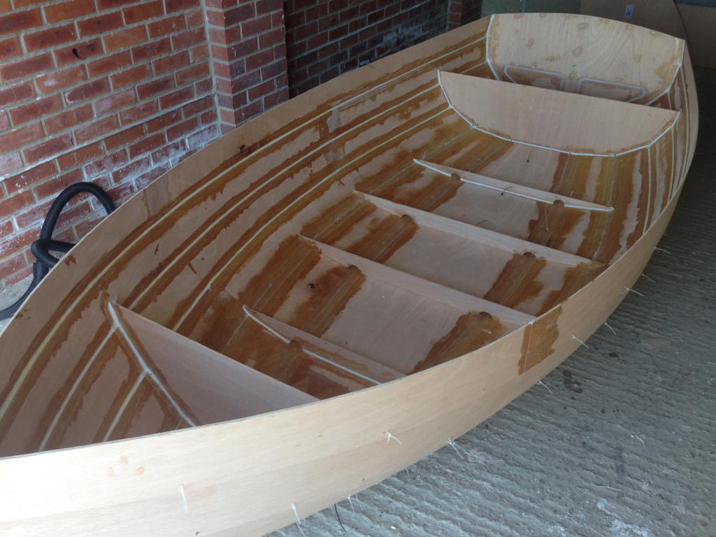 При работах по обшивке корпуса полотна приклеиваются к килю и шпангоутам, а после закрепления гвоздями, дополнительно клей применяется для заделывания полостей в местах прилегания полотен фанеры.