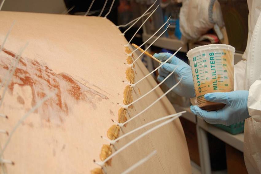 После полного высыхания ткани проводится шпаклевка поверхности и последующая покраска. Для шпаклевки рекомендуются современные готовые шпаклевочные смеси на синтетической основе. Покраска может проходить в два этапа – грунтовка и покраска краской, или покрытие двумя слоями краски.