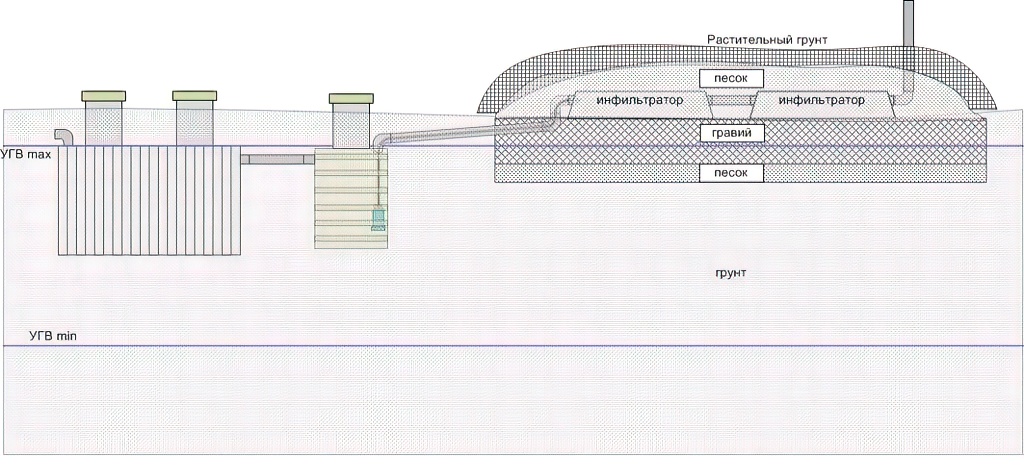 Схема с фильтрующим колодцем возможна при хорошей способности грунтов отводить воду (пески, Супеси) и низком УГВ (ниже 3 м)