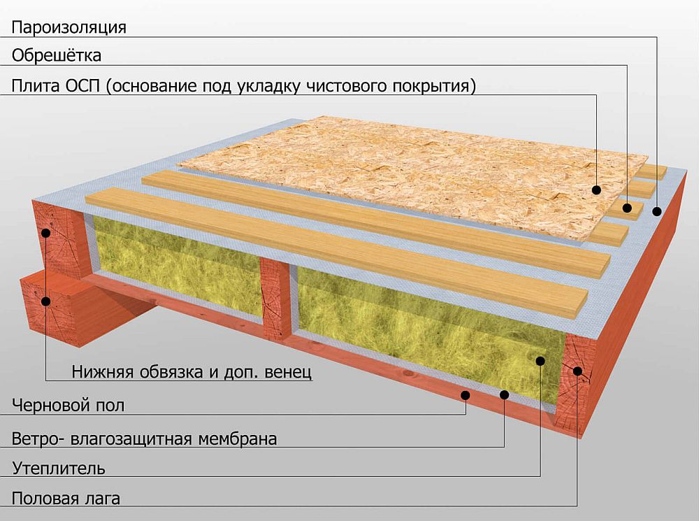 Затем настил пола и его утепление выполняют по следующей схеме: