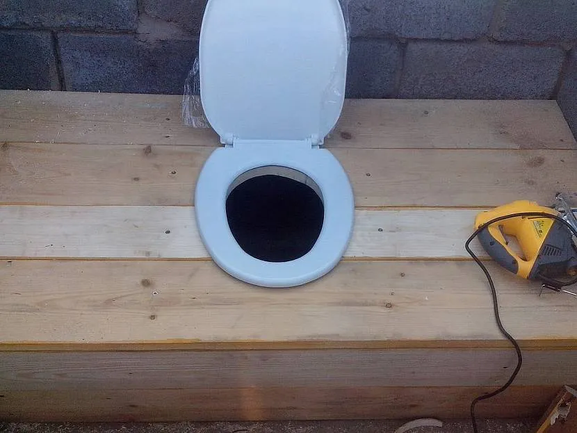 Сооружение сверху покрывают панелями (пластиковыми, деревянными). Отверстие располагают ближе к угловой части. Дыру выпиливают лобзиком, края зачищают наждачной бумагой. Если конструкцию сделали из древесины, то все поверхности обрабатывают влагоотталкивающей смесью. В качестве сиденья можно взять модель с крышкой от обычного унитаза.