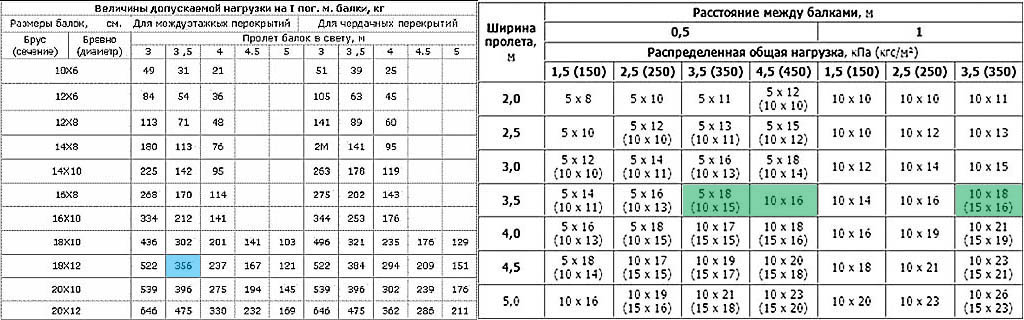 Проверим расчет на соответствие священному писанию – СНиП. В левой табл. на след. рис. ищем балку ближайшего меньшего сечения, это будет балка 180х120 (15х15 = 225; 18х12 = 216). На пролете в 3,5 м она, по СНиП на деревянные конструкции, в междуэтажном перекрытии (пол – аналогичен) выдержит 356 кгс/м (выделено бирюзовым), прекрасно!