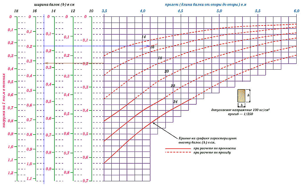 Прежде всего по номограмме на рис. определим предварительно допустимую погонажную (на метр длины) весовую нагрузку на балки. Пользуемся только пунктирными красными кривыми (расчет по прогибу 1:350), чтобы не влезть случайно в область опасных нагрузок. А чтобы не маяться с учетом местных нагрузок на древесину, балки с пролетом до 3,5 м считаем 3,5 метровыми.
