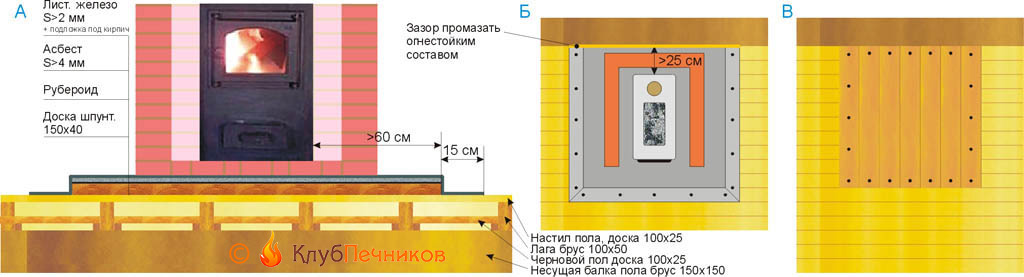 Схема установки металлической печи в кирпичном экране на пол без фундамента