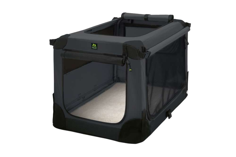 Как окна, так и двери оснащены застёжками-молниями. Такие складные клетки берут для дома, выставочных мероприятий, поездок на природу в машине и к ветеринару. Эти изделия различных размеров производит отечественная компания Triol. При необходимости можно найти мягкую клетку для крупных собак либо для маленьких. Стоимость варьируется в зависимости от размера вольера и материала. Единственный минус тканевой клетки — она не подойдёт для слишком активных животных. Они могут погрызть и разорвать её.