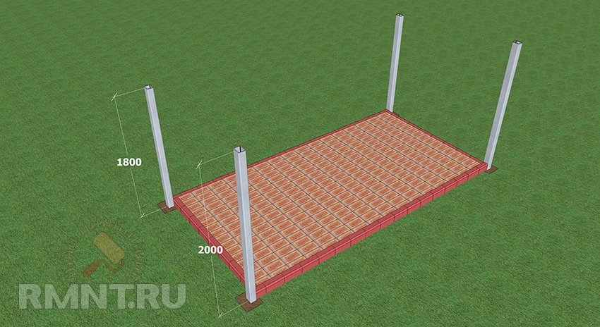 Вкапывать опоры нужно по внешней стороне площадки, чтобы они вплотную примыкали к бордюрным камням. Достаточно пробурить лунки садовым буром диаметром немного больше ширины стоек. Закапывать нужно на глубину порядка 1/3 общей длины. Высота стоек и, соответственно, потолка вольера не должна быть меньше 1,5 метров, в идеале это 1,8–2 метра.