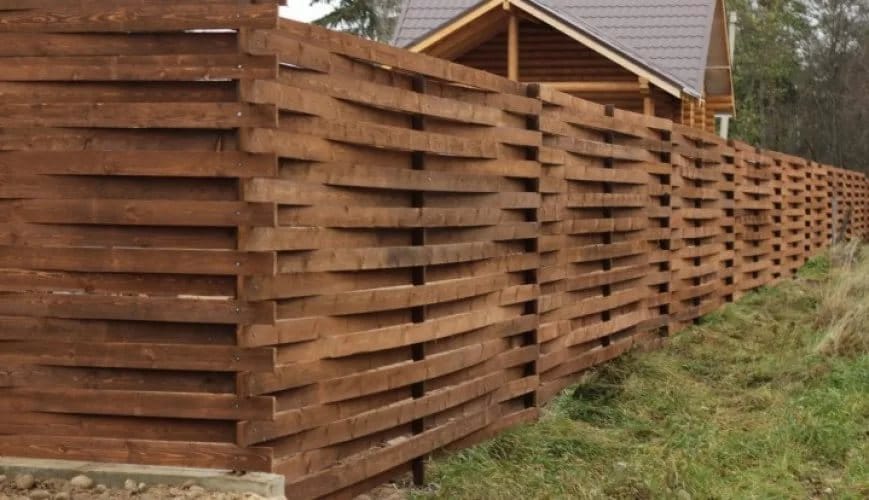 Самый распространенный вариант деревянного заграждения – это штакетник. Чтобы его построить своими руками, нужно установить горизонтальные лаги, к которым будут в вертикальном положении прикреплены деревянные доски. Расстояние между досками можно менять, благодаря чему удастся получить: